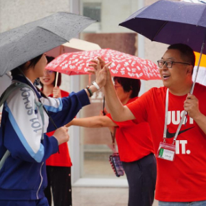 虽然天空下着雨,北京一零一中学的送考老师们还是早早在校门口排成一列,与陆续赶来的考生一一击掌鼓劲。在校门口刷脸验证身份后,考生通过提前搭设的红色晴雨走廊,步入候考区及考场。