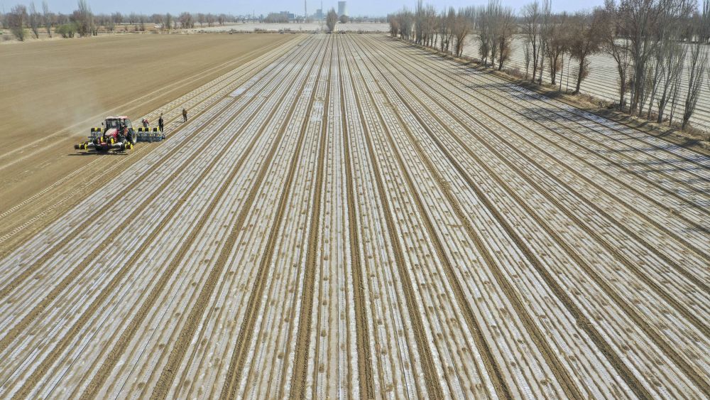 新疆生产建设兵团第一师阿拉尔市的棉田春播(2024年3月26日摄)。新华社发(王志清 摄)