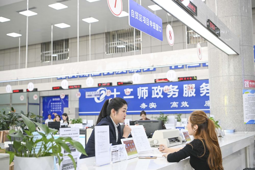 在新疆生产建设兵团第十二师政务服务中心,自贸区项目申报窗口工作人员(左)为前来办事人员讲解相关政策(2024年5月13日摄)。新华社记者 胡虎虎 摄