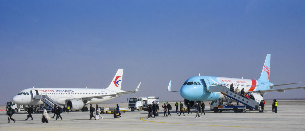 在新疆生产建设兵团第三师图木舒克机场,旅客走下舷梯(2023年2月2日摄)。新华社发(高磊 摄)