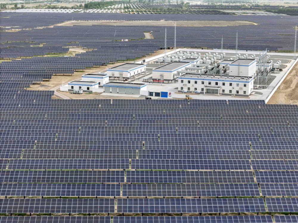 新疆生产建设兵团第八师石河子市的一处100万千瓦光伏基地(2024年5月14日摄,无人机照片)。新华社记者 胡虎虎 摄