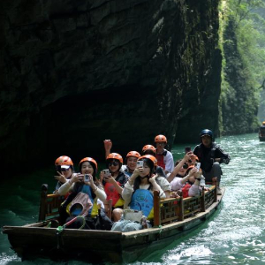 5月28日,游人在鹤峰县屏山旅游景区乘坐小船游玩。新华社发(杨顺丕摄)