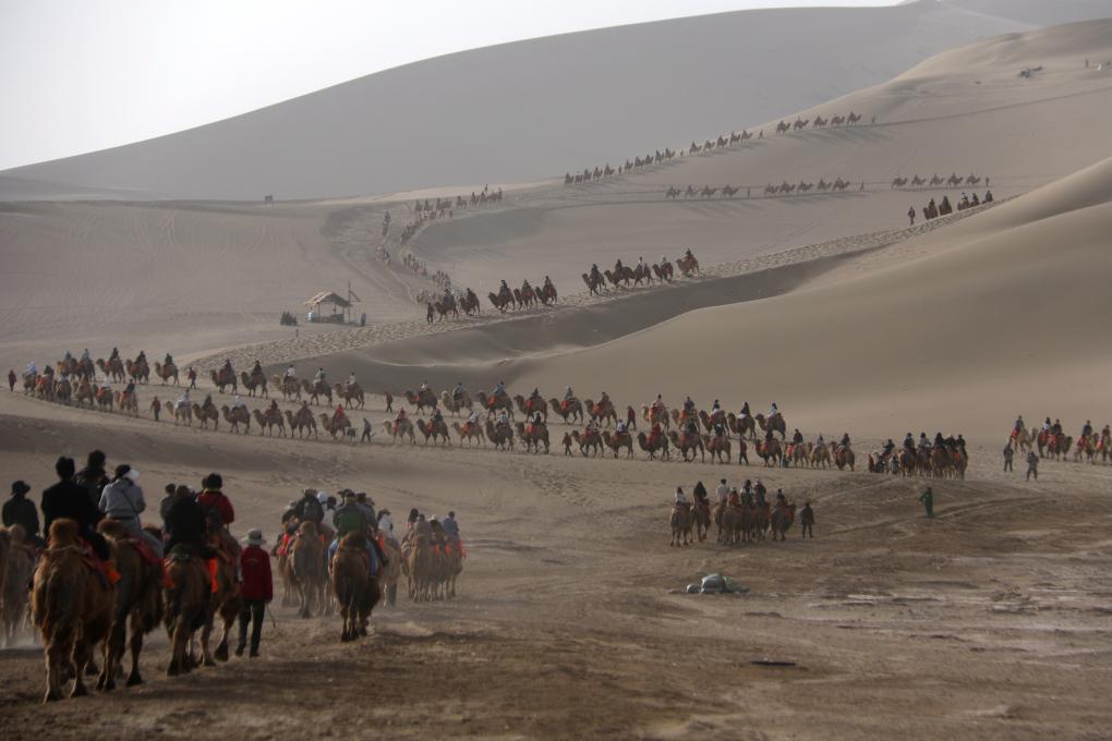 甘肃敦煌鸣沙山上,游客体验沙漠骆驼骑行的队伍自山脊蜿蜒至山脚,仿佛古时大军行进,引起不少网友对沙场征战情景的代入。