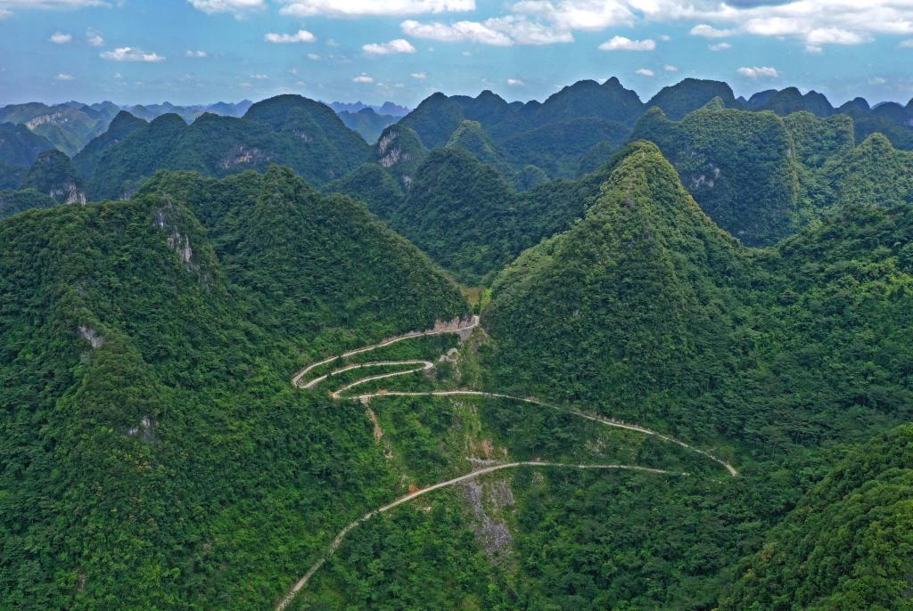 盘山公路穿越漫山翠绿的广西都安瑶族自治县三只羊乡鸡峒村。新华社记者 周华 摄