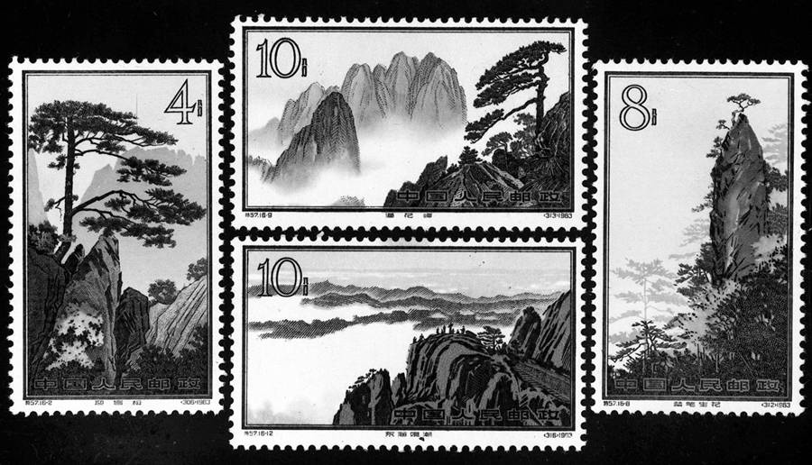 1963年10月15日发行的“黄山风景”邮票中的四枚:迎客松(4分、左)、莲花峰(10分、中上)、东海观潮(10分、中下)、梦笔生花(8分、右)。