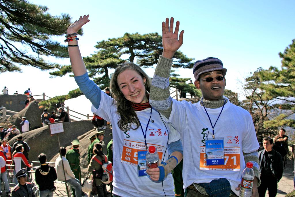 2007年11月21日,参加中国黄山国际登山大会比赛的选手在终点迎客松前留影。