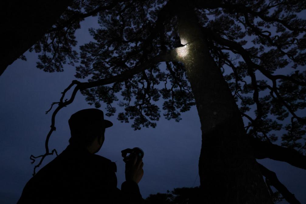 2024年6月4日,丁丁在用放大镜检查迎客松的树皮。