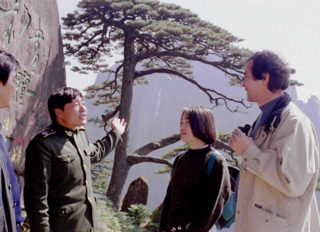 1997年,黄山园林局的青年职工谢红卫向游人介绍迎客松。