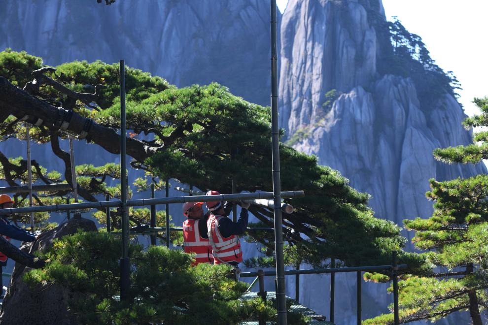 2022年10月12日,工人在搭建用于迎客松“全面体检”的临时工作平台。