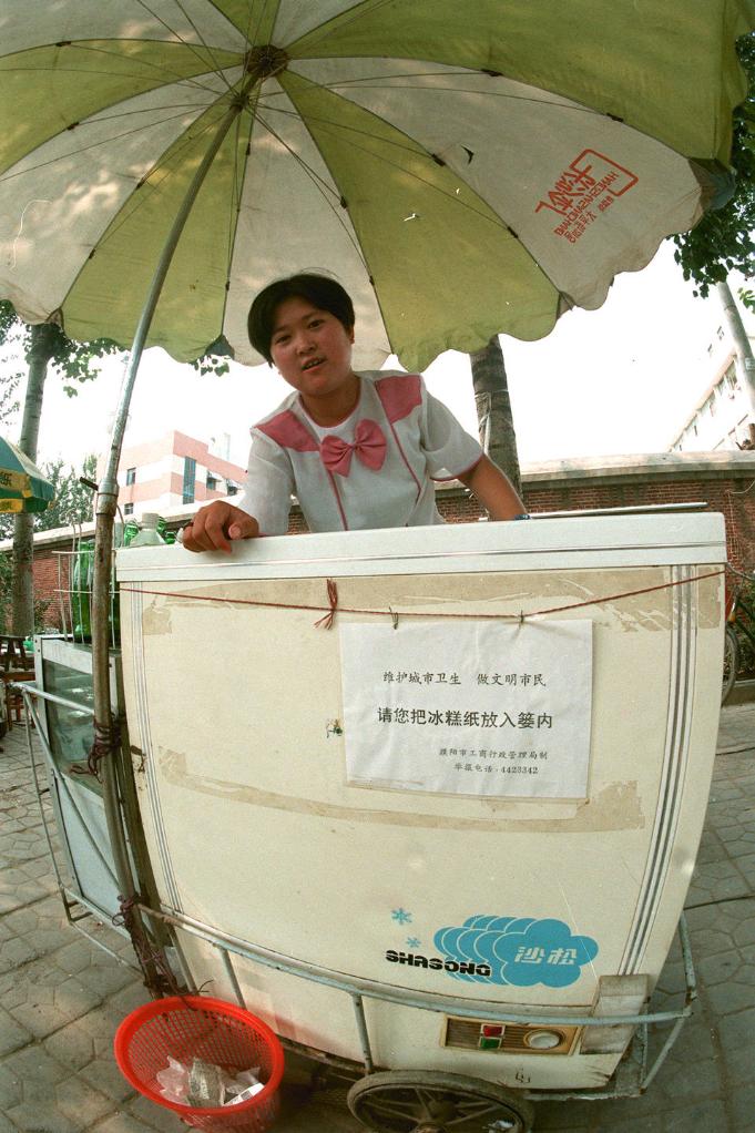 1998年6月在河南省濮阳市拍摄的卖冰糕的商贩。