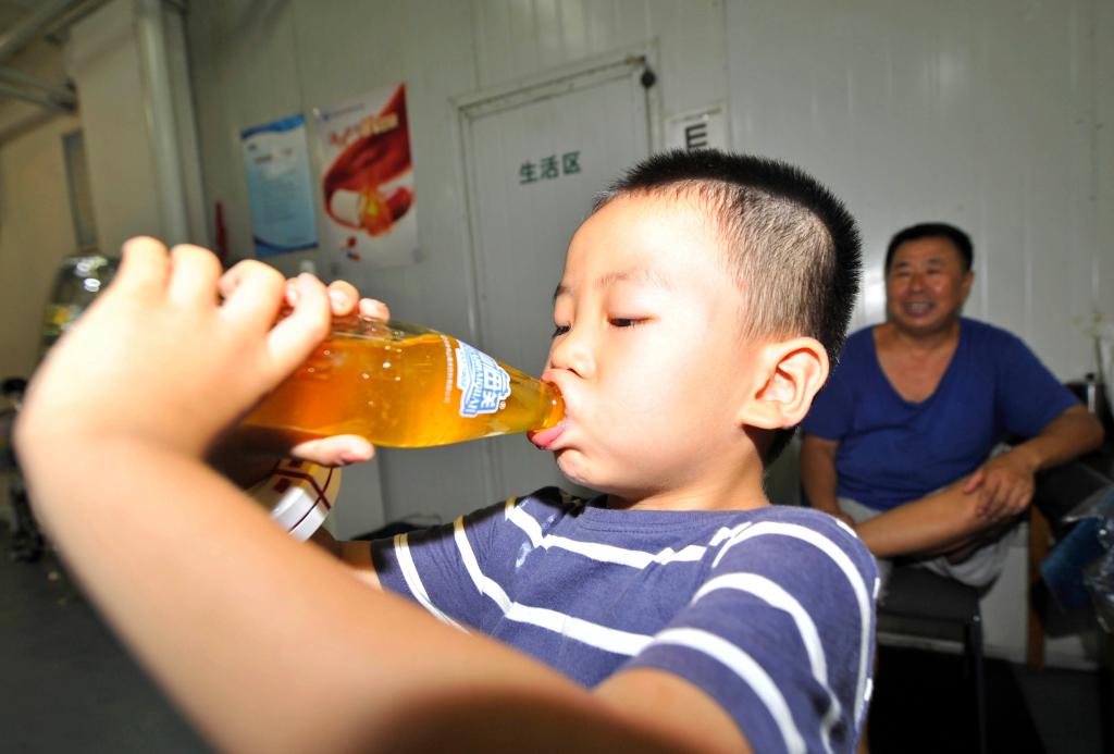 2014年8月9日,天津一名男孩饮用“山海关”汽水。当日,具有百余年历史、曾一度退出市场的“山海关”汽水重新上市销售。