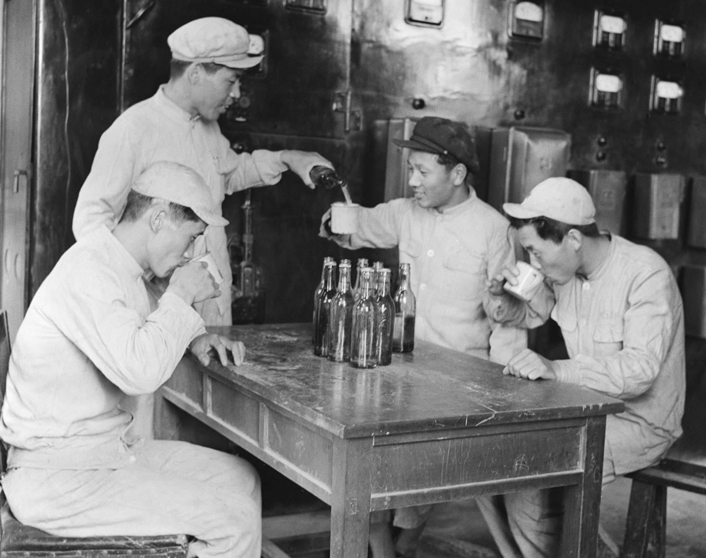 第一汽车制造厂锻工、铸工、热处理等车间,室内温度较高,除设有通风装置外,厂方还给生产工人准备了大量盐汽水,供给工人饮用。这是铸工车间工人陈士华(右)等在喝盐汽水(1956年8月资料照片)。