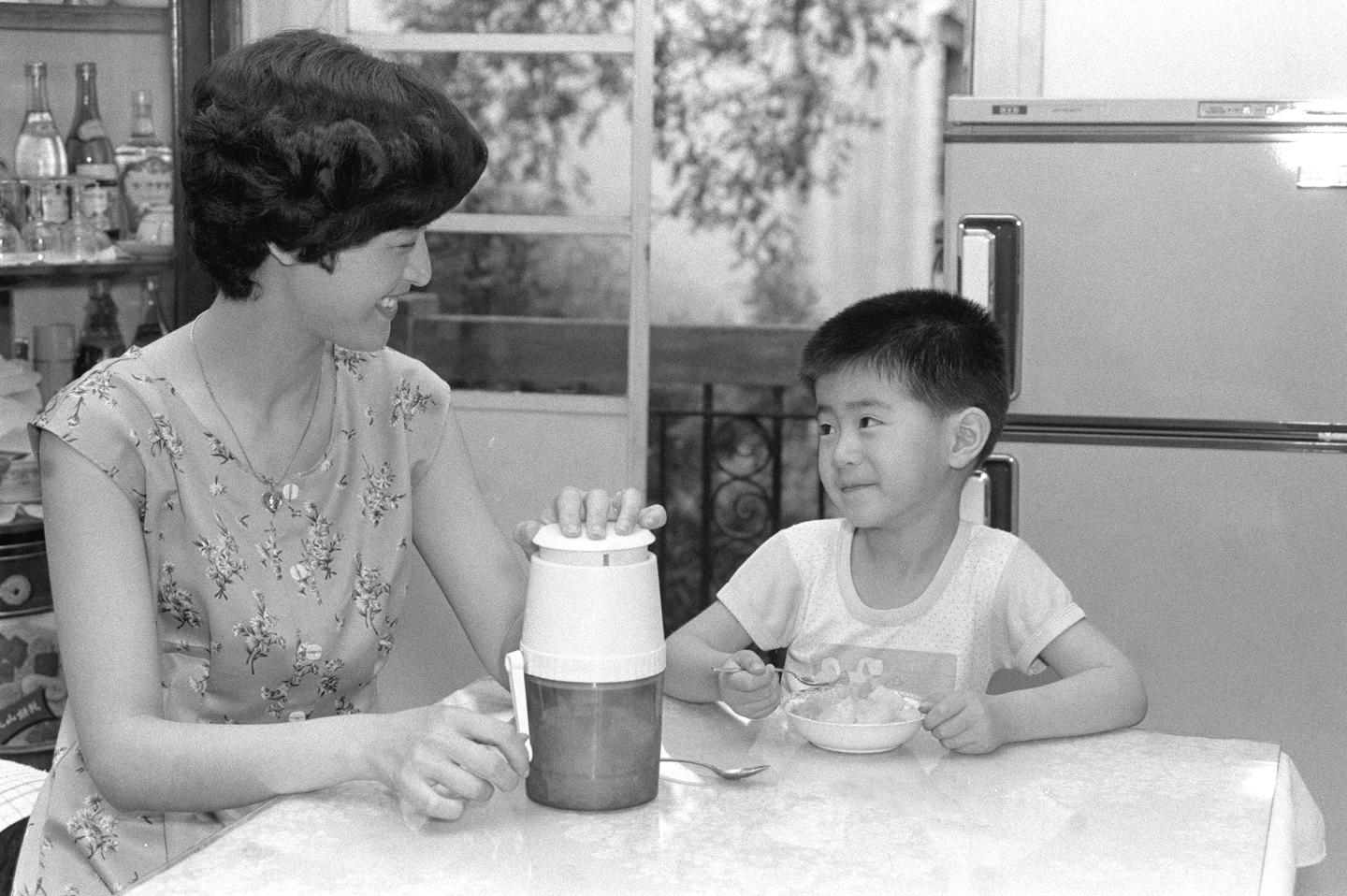 随着包括电冰箱在内的家用电器的逐步普及,冷饮成为上海市民夏季食谱中必不可少的内容。这是一位母亲正用1986年新上市的手摇刨冰机给孩子做刨冰。