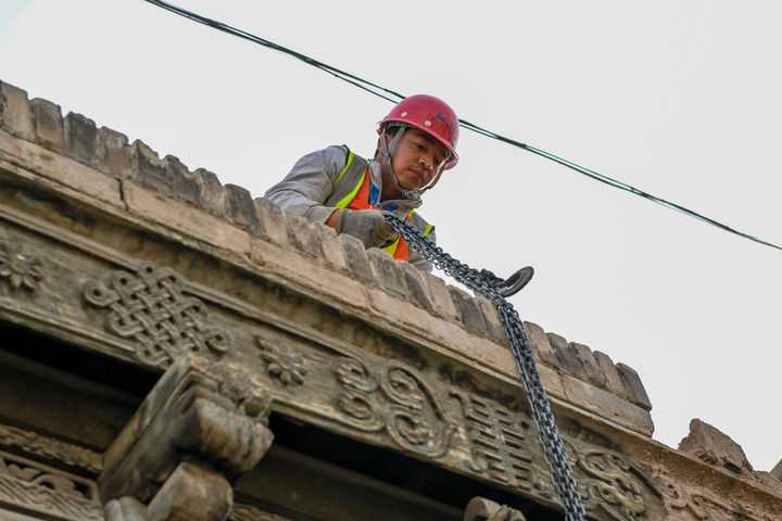 工人在新疆库车市一座古民居内进行修缮工作。外廊挂檐板上雕刻着寿字纹、同心结、如意云头和卷草纹等图案(2023年10月19日摄)。