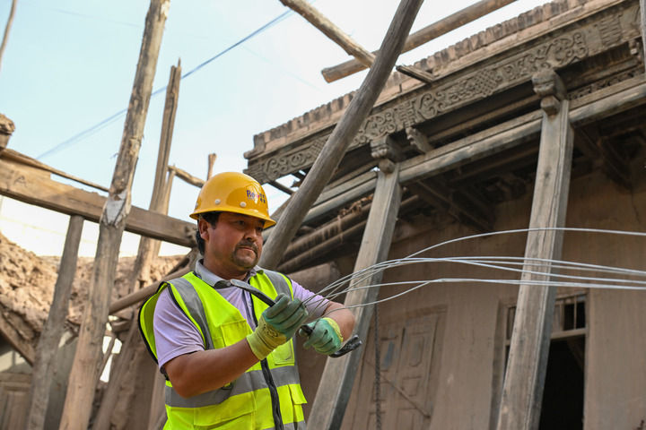 工人在新疆库车市一座古民居内进行修缮工作(2023年10月19日摄)。