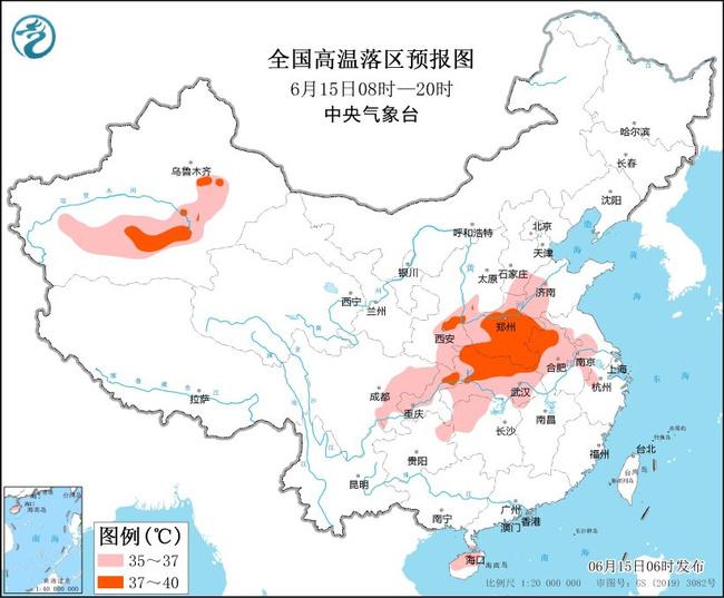 预计6月15日白天,新疆南疆盆地、陕西中南部、山西南部、河北南部、山东西部、河南、安徽、江苏西部、湖北、湖南西北部、四川盆地、海南岛等地有35~36℃高温天气,其中,新疆南疆盆地、陕西中部、河南、安徽西北部、湖北北部、重庆东北部、海南岛西北部等地部分地区最高气温可达37~40℃。
