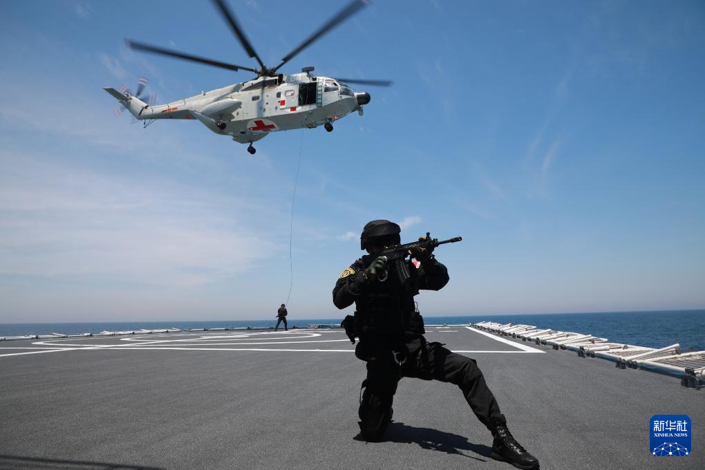 这是6月1日,中国海军“和平方舟”号医院船起航前组织特战队员索降训练。新华社发(刘志磊 摄)