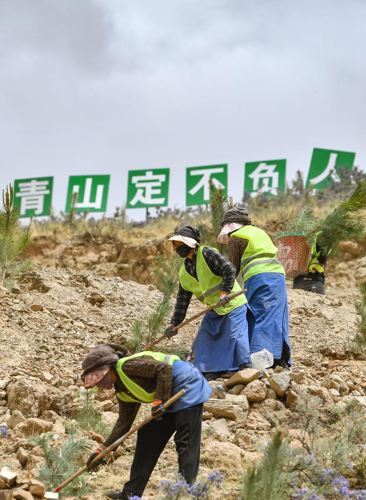 在拉萨南北山绿化2024年度一期工程贡嘎县造林项目贡嘎2号片区,当地村民在栽树造林(6月3日摄)。新华社记者 晋美多吉 摄