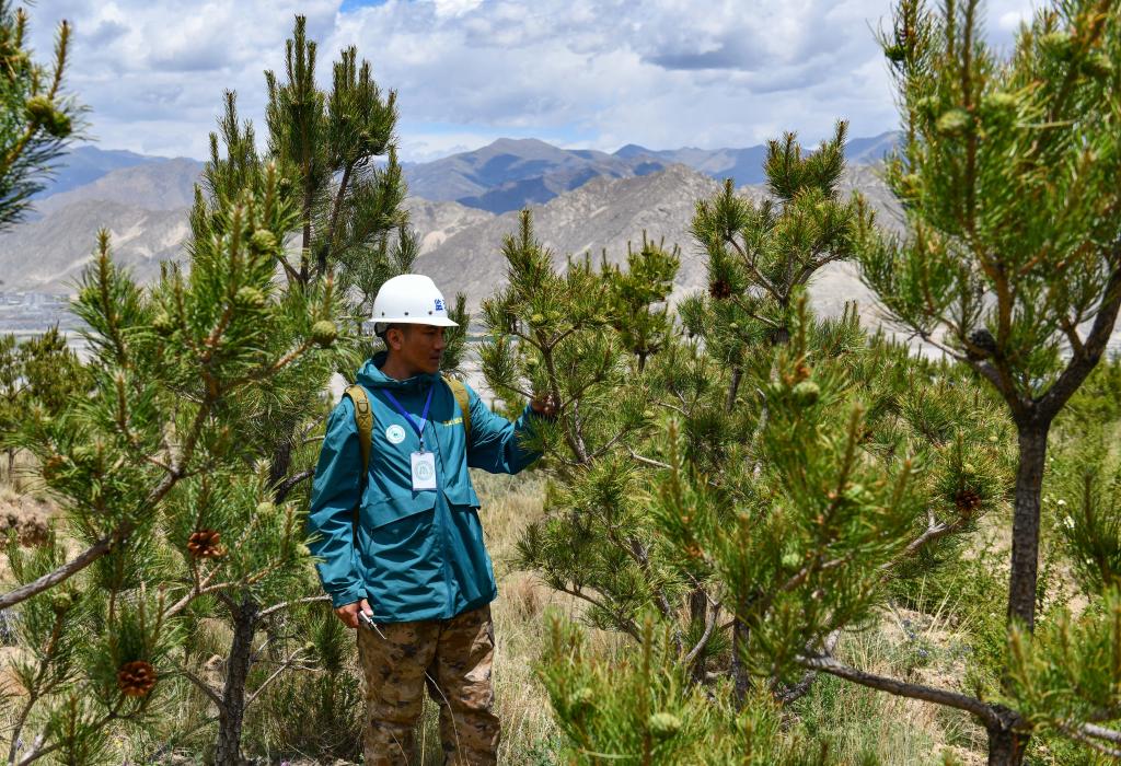 拉萨南北山绿化工程2024年度巩固提升(贡嘎机场周边山体)工程项目上,第三方监理人员在检查树木状况(6月3日摄)。新华社记者 晋美多吉 摄
