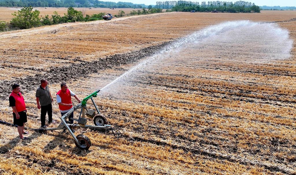 △6月12日,安徽亳州,抗旱小分队帮助村民为刚播种的玉米进行浇水补墒。