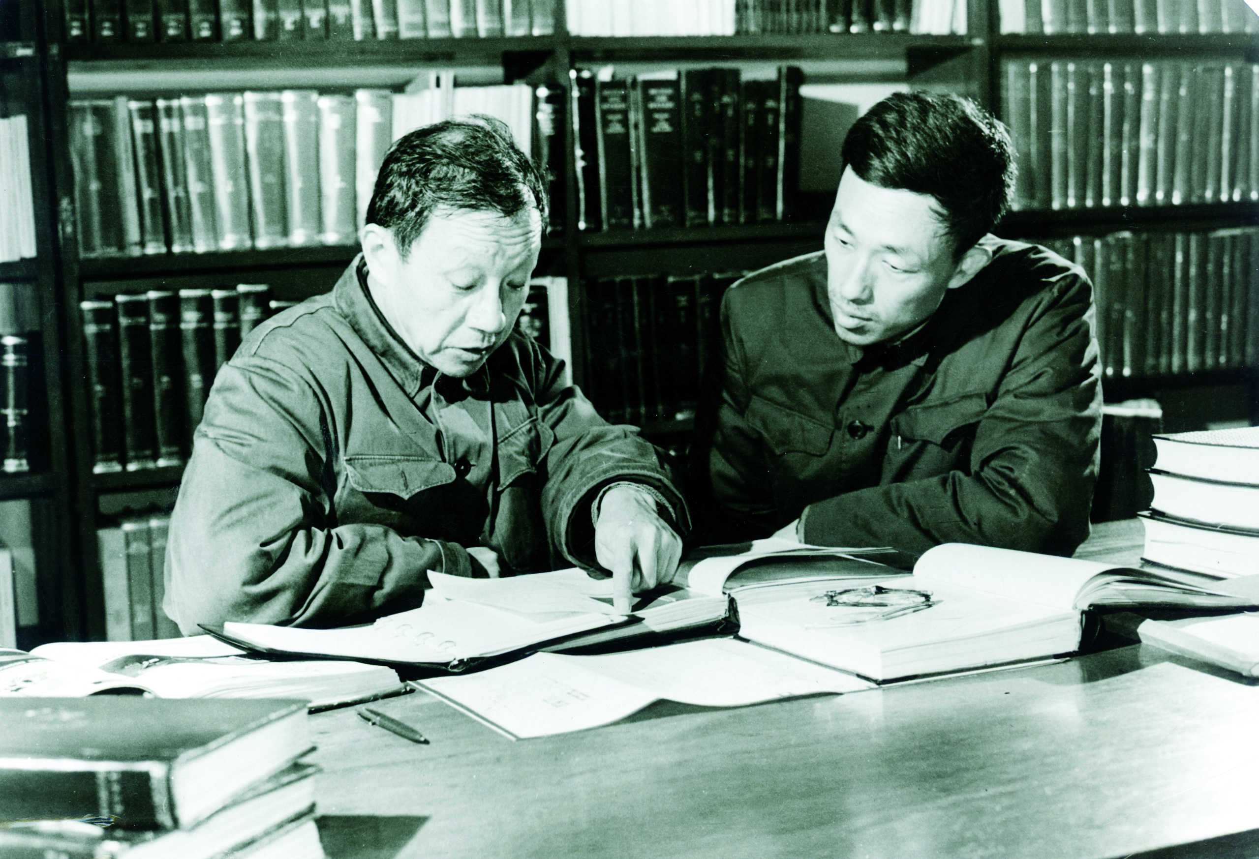 王大珩(左)与蒋筑英进行学术交流工作(资料图)。