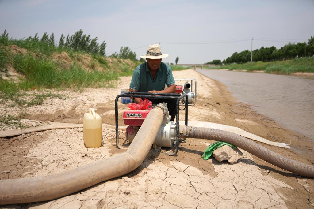6月18日,在山东省菏泽市郓城县玉皇庙镇,农户在郓城县南送水干线主渠道取用黄河水。新华社记者 徐速绘 摄