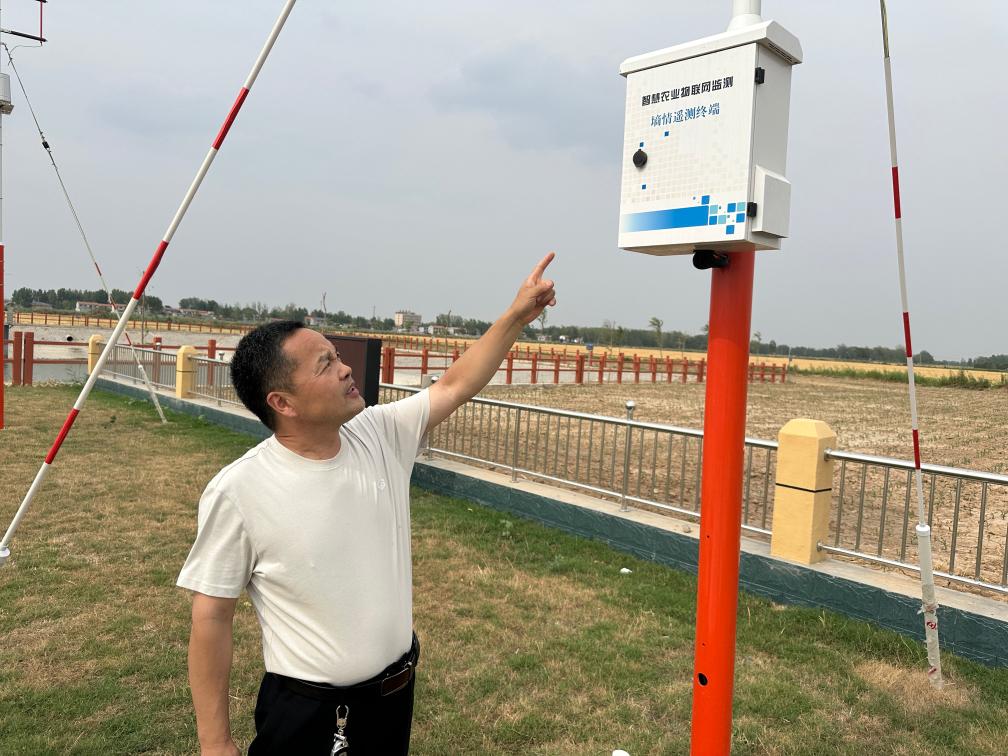 6月18日,在山东省菏泽市巨野县龙堌镇,县农业农村局土肥站站长韩继良在“四情”监测站检查墒情遥测终端。新华社记者 王阳 摄