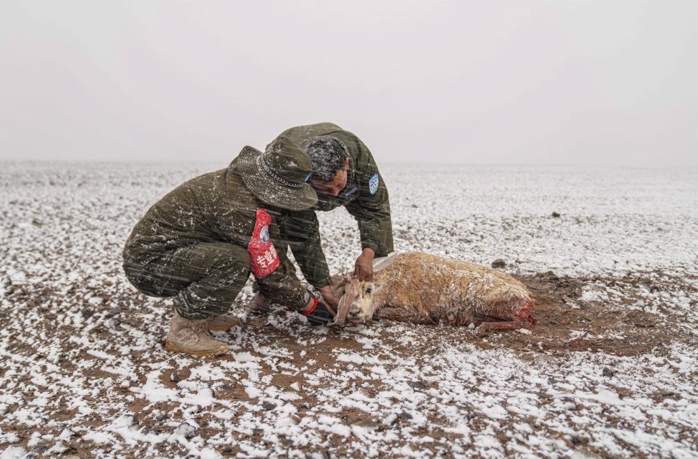 管护员在救治受伤的藏羚羊(6月14日摄)。新华社记者 晋美多吉 摄
