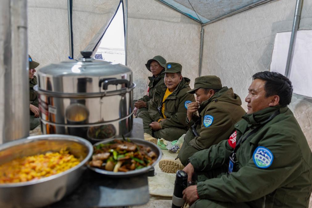 野生动物专业管护队员们在巡护途中宿营的帐篷内准备吃饭(5月7日摄)。新华社记者 姜帆 摄