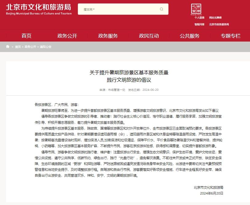 暑期旅游旺季将至,为进一步提升首都旅游景区基本服务质量,增强游客文明旅游意识,北京市文化和旅游局发出如下倡议: