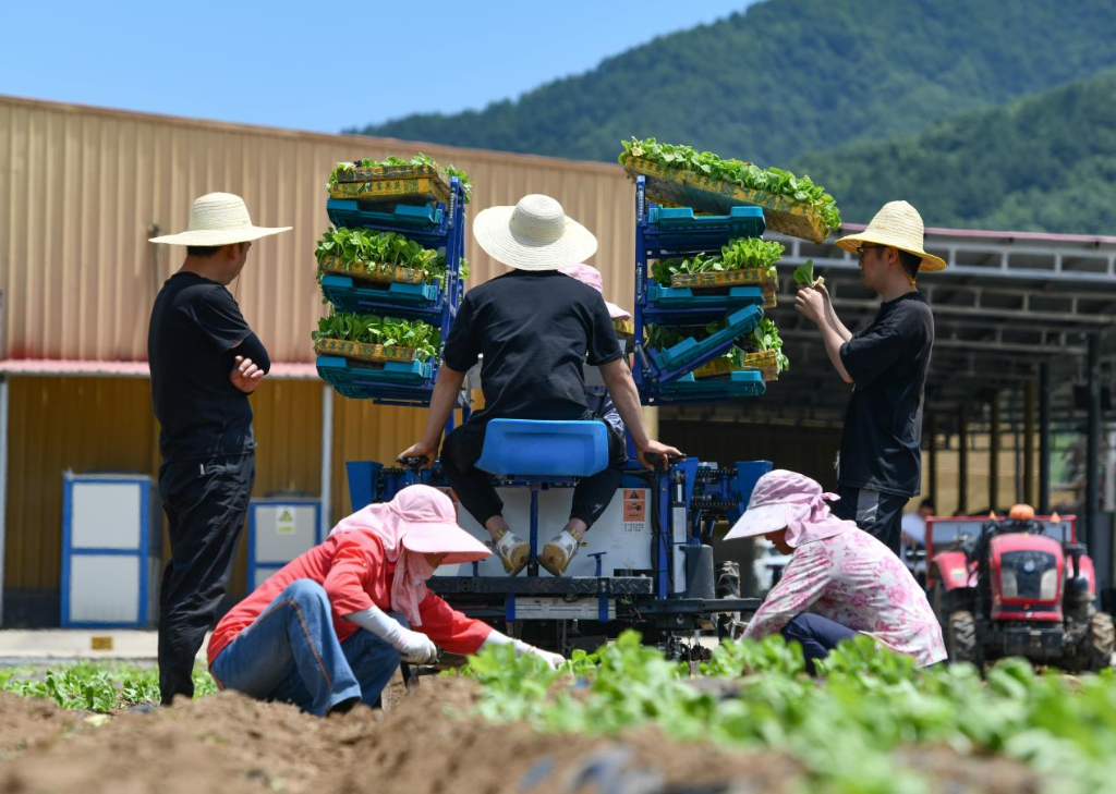 6月24日,在太白县咀头镇一处高山蔬菜田里,农户在栽种蔬菜苗。新华社记者 蔡湘鑫 摄