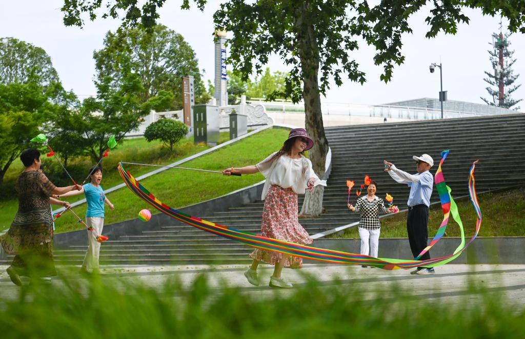 6月23日,市民在汉中天汉湿地公园练习彩带舞。新华社记者蔡湘鑫 摄