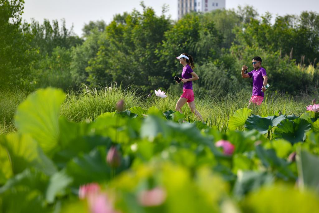 6月23日,汉中市民在天汉湿地公园内跑步。新华社记者蔡湘鑫 摄