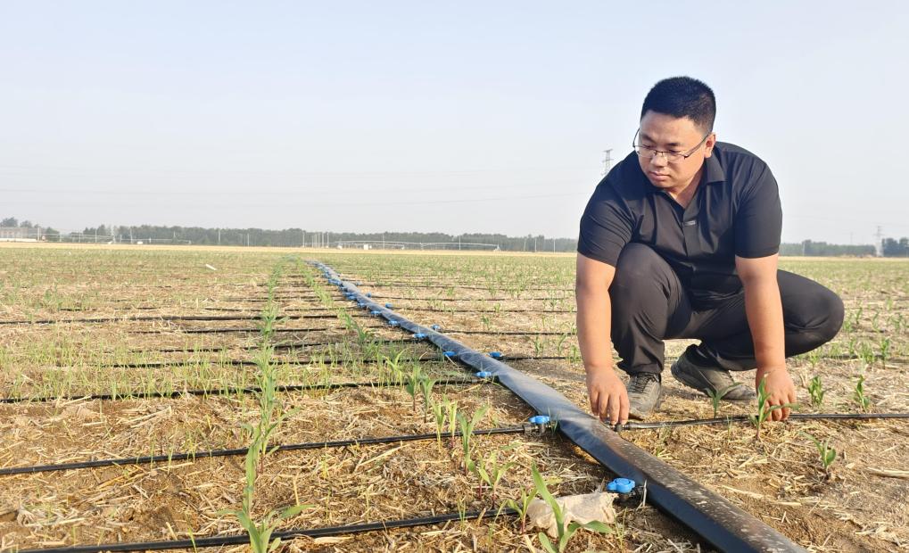 在山东省聊城市高唐县鼎昇种植家庭农场,农场负责人李金阳检查滴灌带设备。新华社记者 王阳 摄