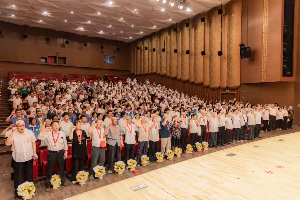 湖西街道“光荣在党50年”纪念章获得者在长影音乐厅里重温入党誓词。(受访单位供图)
