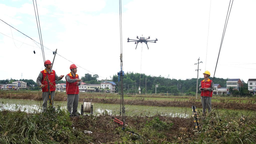 7月3日,在平江县安定镇大桥村10千伏思秋线杨树桥支线抢修现场,国网岳阳供电公司的抢修突击队队员彭讲书操作无人机牵引绳,开展跨河放线工作。“过去需要人工涉河作业,至少要1小时才能完成放线作业,现在通过无人机,5分钟就能搞定。”