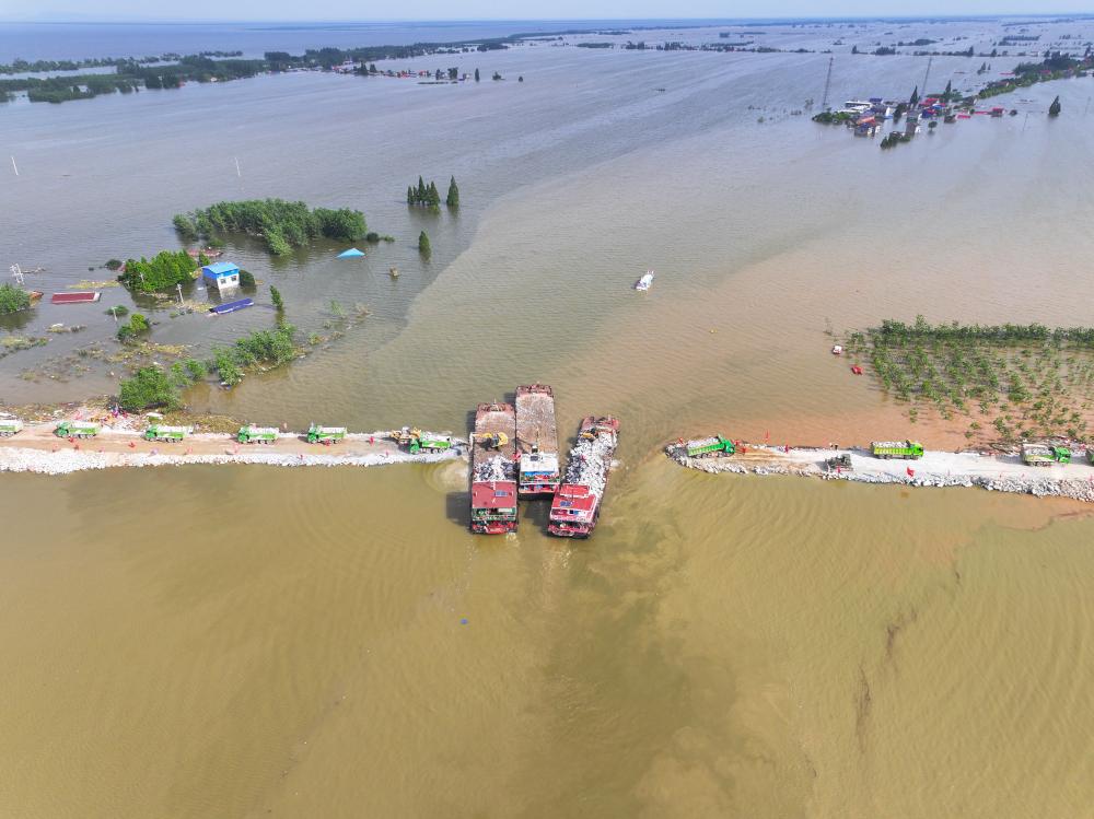 7月5日下午,湖南岳阳华容县团洲垸洞庭湖一线堤防发生决口,堵口作业于6日启动。抢险队伍紧急修筑起作业平台,“连轴”作战,从决口左右两边双向作业。根据抢险方案,堵口作业主要有抢筑裹头、双向立堵、突击合龙、加高加固、防渗闭气等5个关键环节。(记者阮周围、谢奔、白田田)