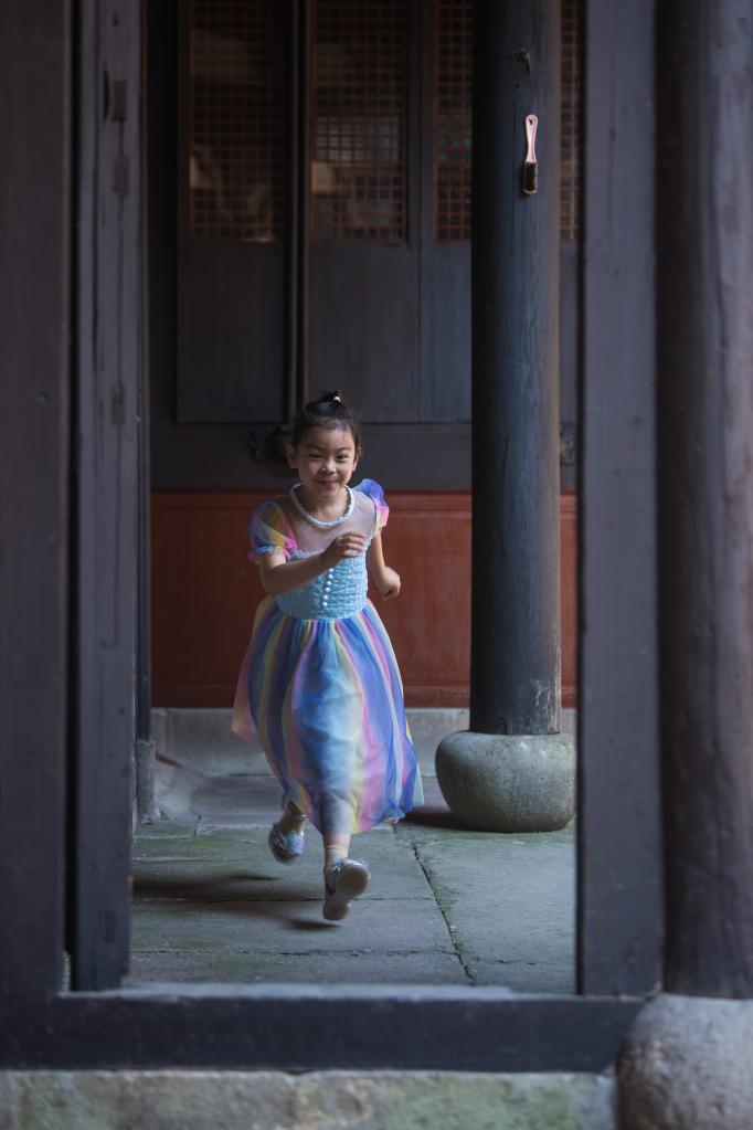 ↑7月10日,邱芮伊在宁波慈城古县城奶奶居住的老屋内玩耍。