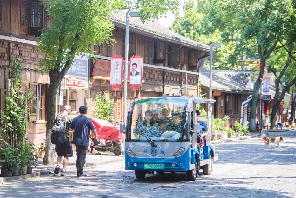 ↑7月10日,游客乘坐游览车观赏宁波慈城古县城街景。