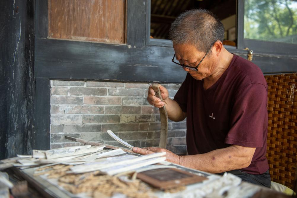 ↑7月10日,骨木镶嵌技艺代表性传承人甘金云在慈城古县城的家中制作骨木镶嵌工艺品。