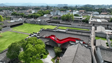 ↑7月9日,游客在宁波慈城古县城内的周信芳戏剧艺术馆参观(无人机照片)。