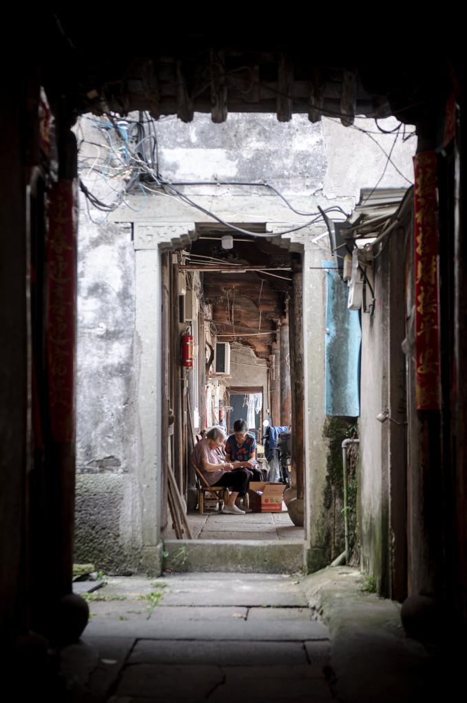 ↑7月10日,慈城居民陈桂芬(右)与孙女邱芮伊行走在古县城的小巷内。