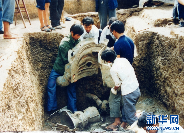 这是在三星堆遗址考古发掘现场3号“祭祀坑”拍摄的青铜面具。新华社记者 沈伯韩 摄