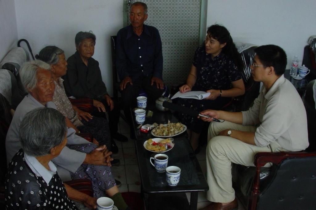 赵阿平(右二)与满族群众交流,开展满文收集工作。新华社发
