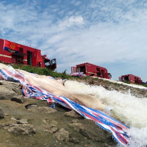 7月14日,株洲消防救援支队消防员正在团洲垸洞庭湖大堤开展排涝作业。(湖南省消防救援总队供图)
