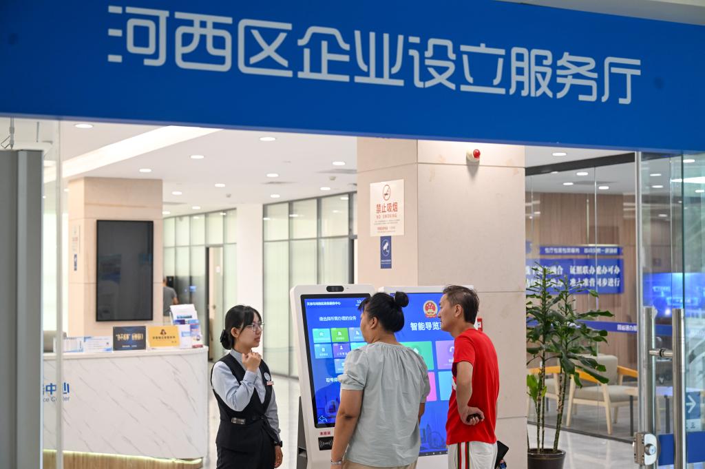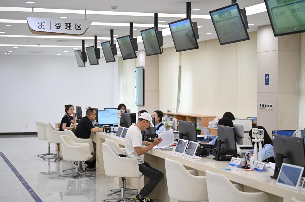 办理人在天津市河西区政务服务中心“跨省通办高效办成一件事”服务专厅内办理业务(7月16日摄)。