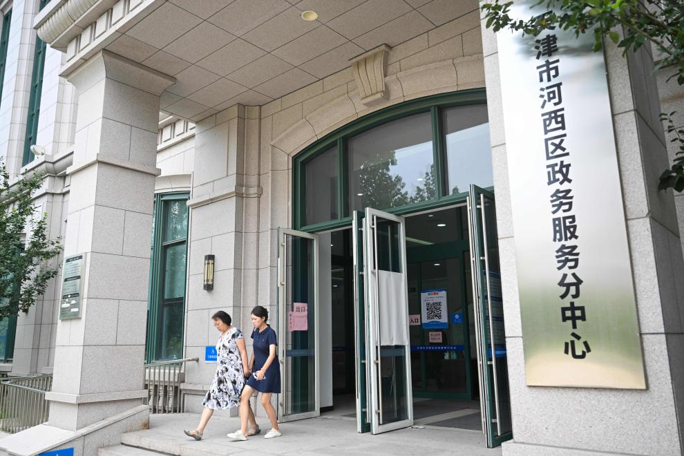 市民办理完业务后走出天津市河西区政务服务分中心(7月15日摄)。