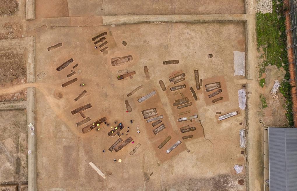 从空中俯瞰位于成都蒲江县的大型船棺墓群(2017年3月1日摄)。