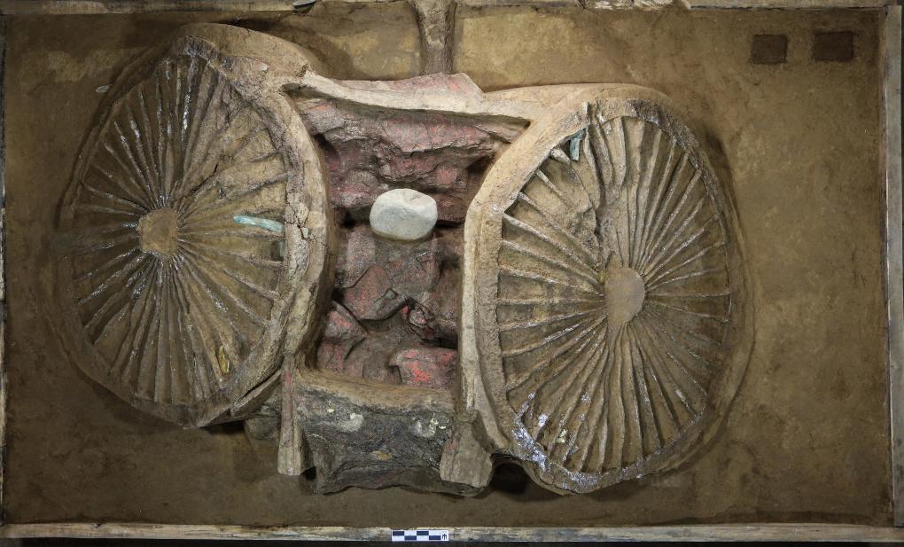 这难不倒经验丰富的科技考古工作者。他们提前拟定了提取方案……当车轮被成功揭取后,车厢部分展露无遗。尤其是车厢的四面立板,不仅以繁缛的髹漆彩绘图案装饰,还镶嵌着若干贴有金箔饰片的金属兽形牌饰,庄严大气富丽堂皇。不难想见,乘坐如此座驾穿行于街市,那是何等的威风。