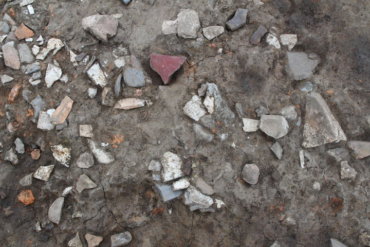 这是2023年12月1日拍摄的四川省广汉市三星堆遗址发掘区玉石器残件堆积。新华社发(四川省文物考古研究院供图)